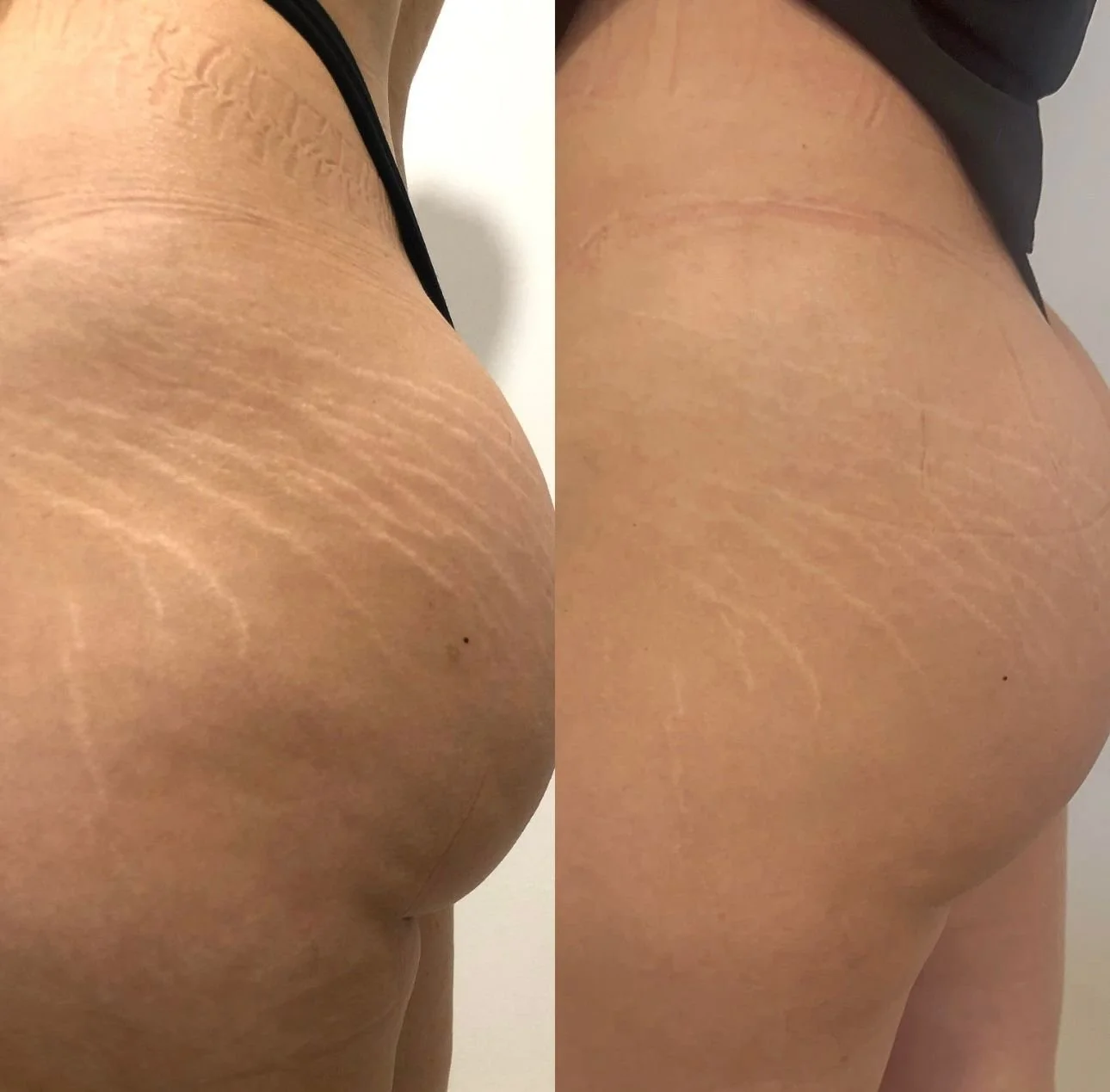 Medical-grade (inkless) serums are applied with precise tattooing techniques along stretch mark lines for optimal absorption. Since stretch marks are scars that lack pigment and collagen, this treatment stimulates collagen production to smooth and lighten the skin over time. Results are enhanced with a medical-grade aftercare serum that accelerates cell regeneration.